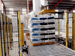 Para una empresa dedicada a la producción de materiales de construcción, se ha suministrado una célula de paletizado con robot de pinza bandeja doble, que permite realizar altas producciones. En este caso se obtendrán aproximadamente 10 palets por hora. Además, se trata de una célula compacta que ocupa el menor espacio posible.