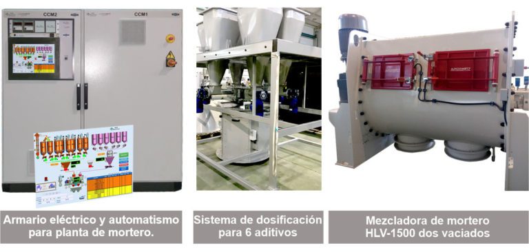 Se ha suministrado para una importante fábrica de morteros en polvo, en Argentina, el automatismo, el sistema de dosificación aditivos sólidos y la mezcladora. Para la automatización y control de todo el proceso se ha suministrado: Sistema Arco A-9030 Basic Mortero, que realiza el control, pesaje y dosificación en la planta. Software Arco Dry Mix, permite controlar y supervisar todos los procesos de una planta de mortero en tiempo real: gestión de fórmulas, pesaje, dosificación de productos mayoritarios, minoritarios y manuales, control de la producción, creación de informes o análisis de la eficiencia de la planta, entre otros. Tablero eléctrico de fuerza y mando de